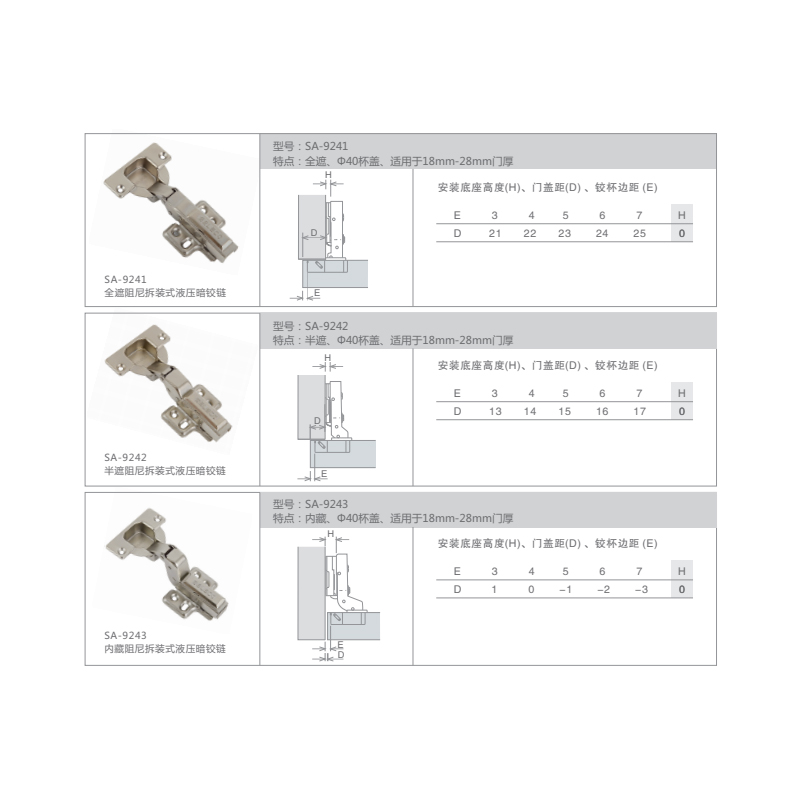 产品名称:拆装阻尼暗铰链 适用范围:适用各类柜门 主要材质:冷轧钢 铰杯深度:11. 5mm 铰杯直径:Φ40mm 面板(E)尺寸:3-7mm 门板厚度:18-25mm 开启角度:105° 最大承重:2只/8KG 主要功能:内置阻尼装置和自闭装置 主要特点:快拆装式 精品福利视频.